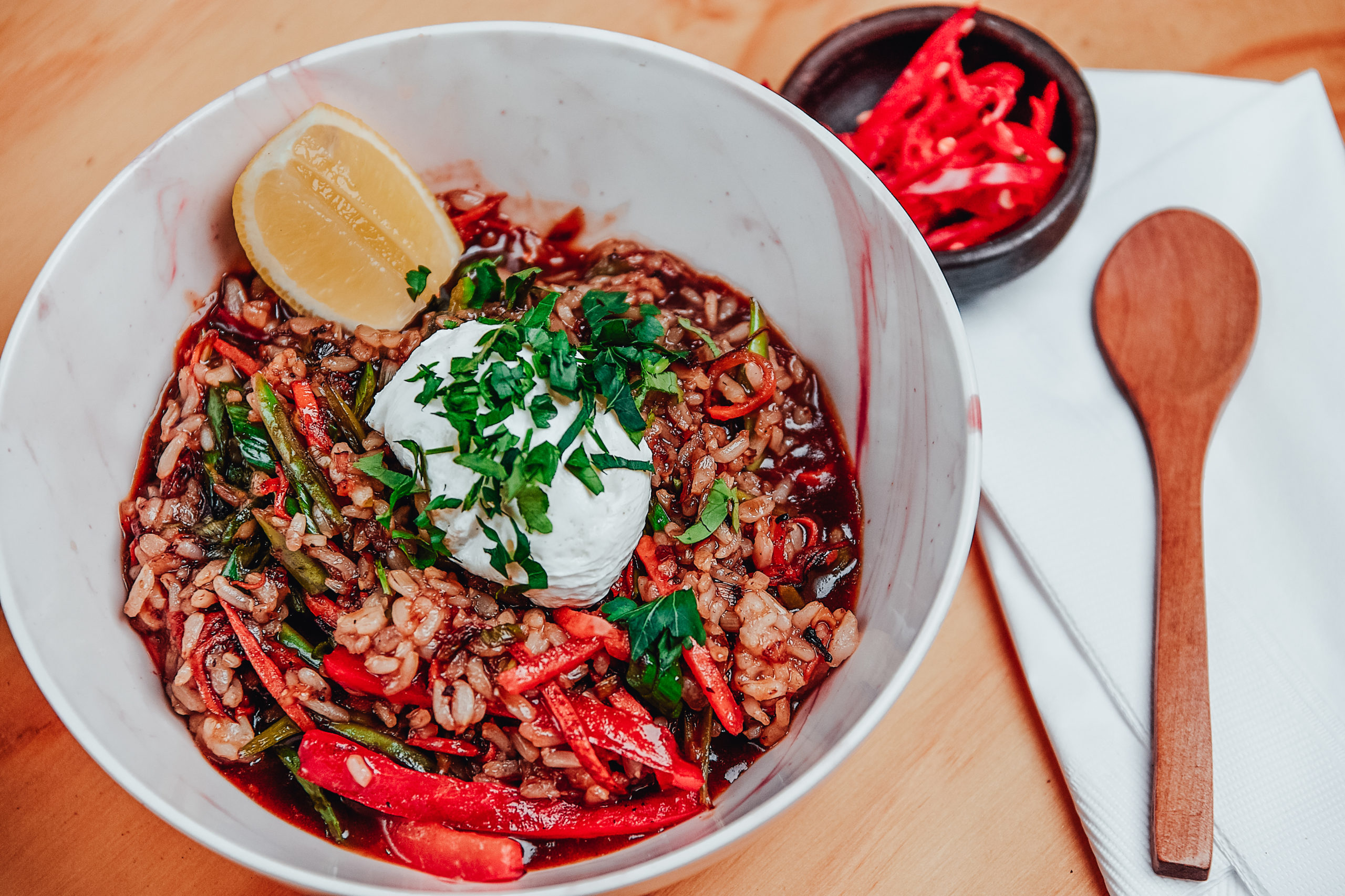Arroz integral salteado en aceite de ajo, jengibre y rocoto acompañado de zanahoria, porotos verdes, pimentón y cebollín. Coronado con cilantro y un toque de limón.