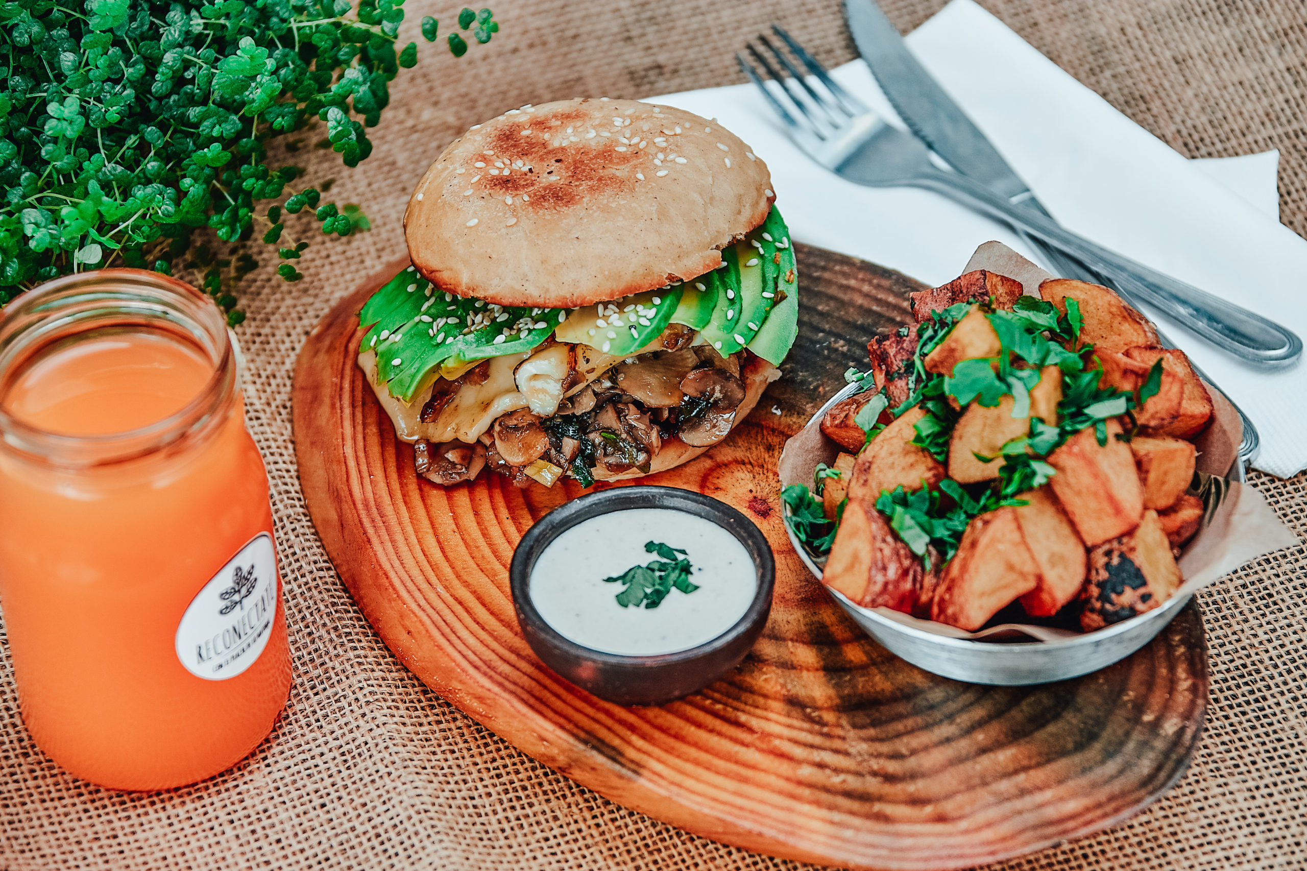 Deliciosa hamburguesa en pan frica de la casa con lechuga, tofu apanado en nori, coleslaw, cebolla morada y alioli.